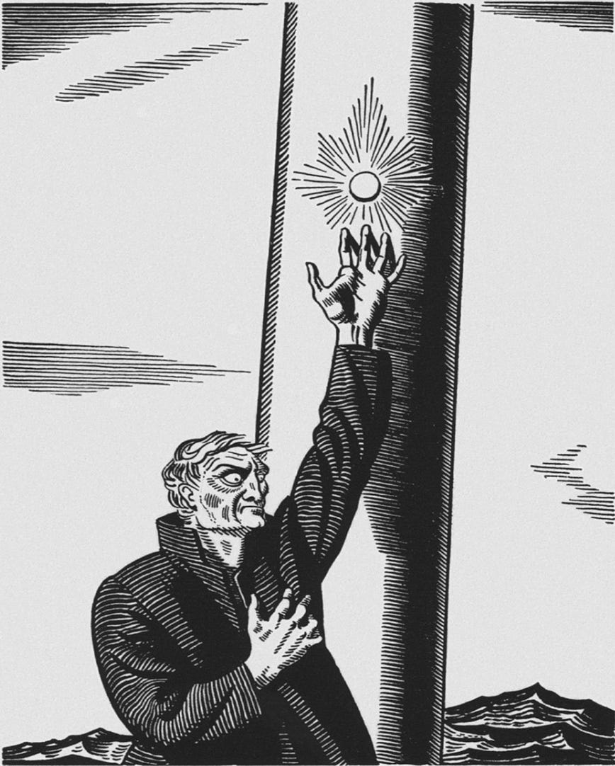 “Hark ye yet again—the little lower layer. All visible objects, man, are but as pasteboard masks. If man will strike, strike through the mask! How can the prisoner reach outside except by thrusting through the wall? To me, the white whale is that wall, shoved near to me.