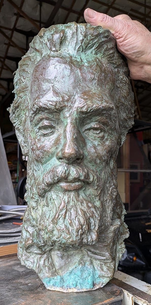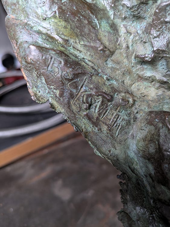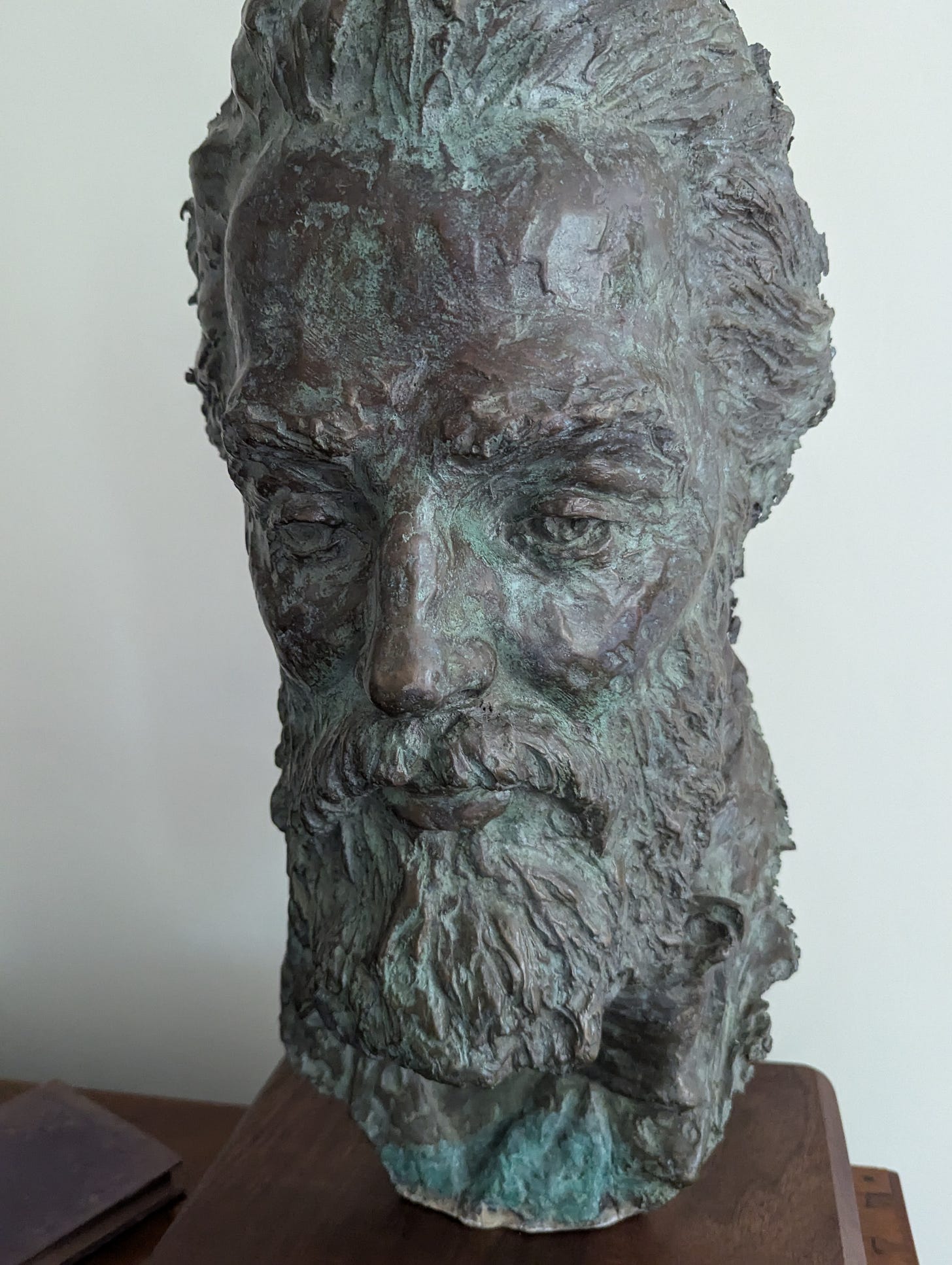 While the bust was en route to Arrowhead, I started poking around for someone local to Pittsfield who might be able to help restore it to whatever extent was possible. We had no money to make this happen but that, as I like to say, was tomorrow’s problem. I quickly found the website for sculptor and painter Andrew DeVries, who lives nearby in the Berkshires. I mentioned the name to Lesley Herzberg, executive director of the Berkshire County Historical Society/Arrowhead, and lo and behold, she informed me that his mother-in-law was an archives volunteer at Arrowhead for thirty years. Andrew agreed without hesitation to help us with the project (so please visit his website and buy a print or some postcards).