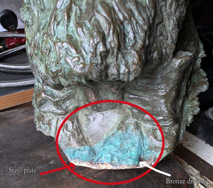 Is what looks to be “aggressive bronze disease” the result of casting a steel plate into the metal?