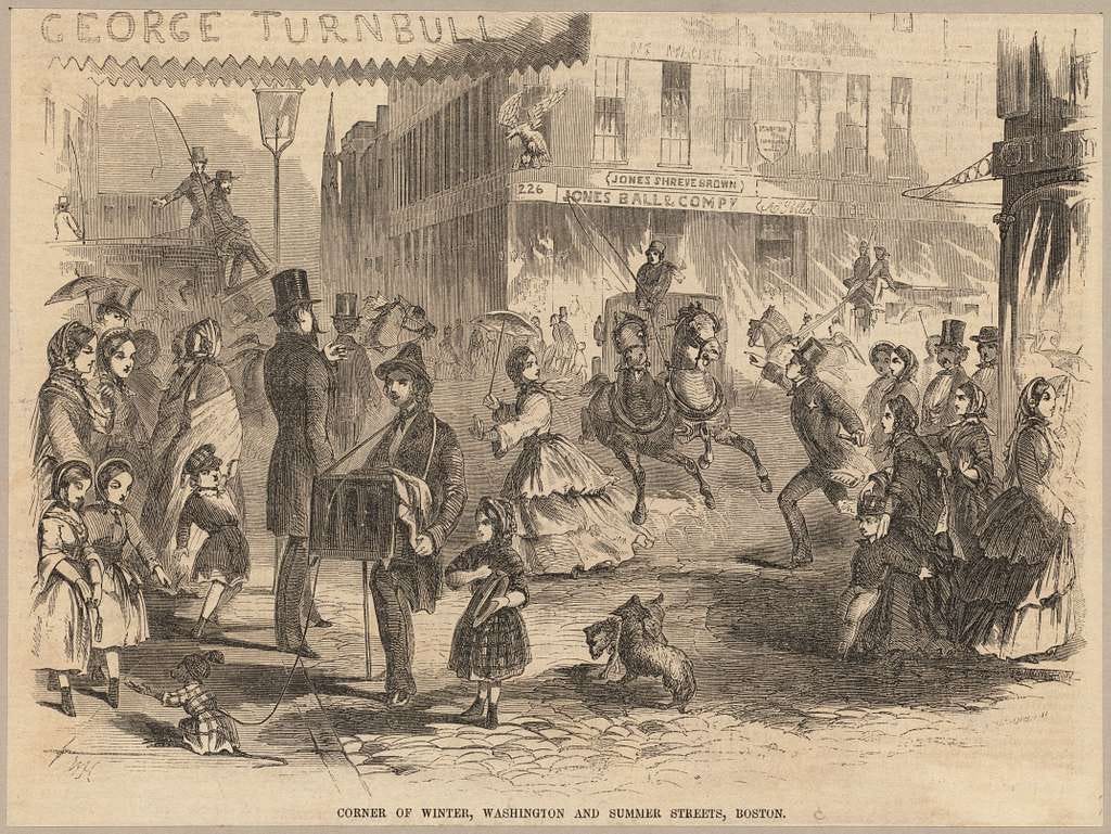 Ballou’s Pictorial Magazine presented a much more chaotic scene at that corner in its June 1857 issue, drawn by none other than Winslow Homer, at the time working as a commercial illustrator. According to the accompanying article, the intersection was “one of the busiest and most brilliant spots in all Boston.”